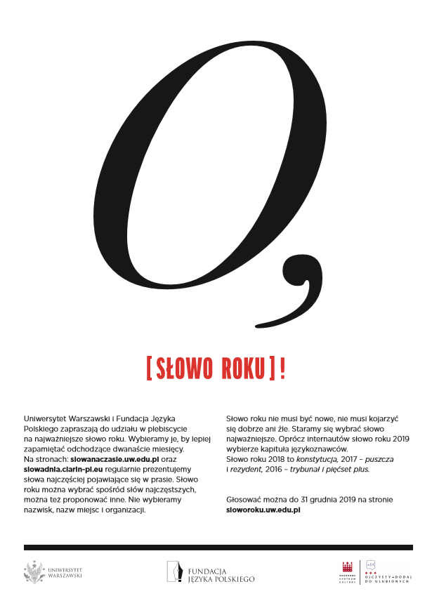 Głos w internetowym plebiscycie na Słowo Roku 2019 można oddać do 31 grudnia. Jego rozstrzygnięcie odbędzie się na początku 2020 roku. Więcej informacji oraz regulamin głosowania znajduje się na stronach: http://sloworoku.uw.edu.pl/ oraz http://www.slowanaczasie.uw.edu.pl/