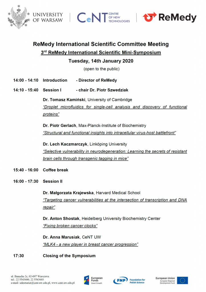 Serdecznie zapraszamy do udziału w sympozjum naukowym, które odbędzie się w dniu 14 stycznia 2020 r. (wtorek) w auli 00.142 budynku CeNT UW. W trakcie sympozjum zaprezentują się kandydaci na stanowisko Kierownika Grupy Badawczej w ramach MAB ReMedy. Sympozjum odbędzie się w ramach spotkania Międzynarodowego Komitetu Naukowego ReMedy.