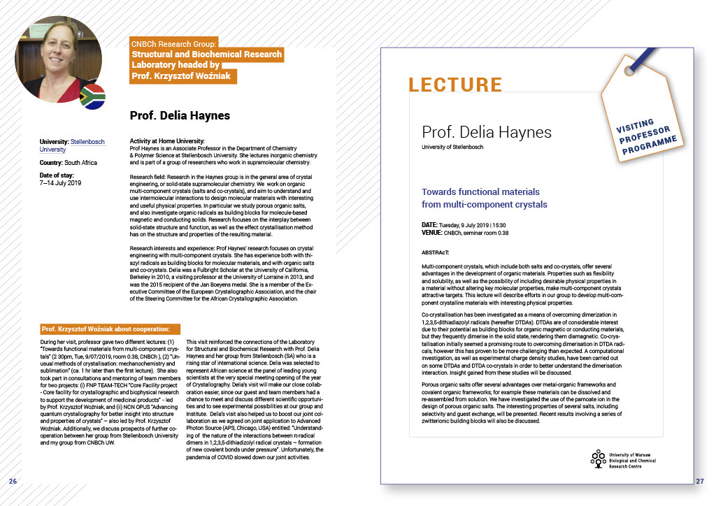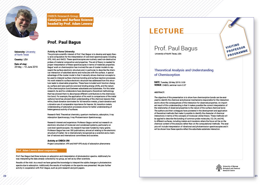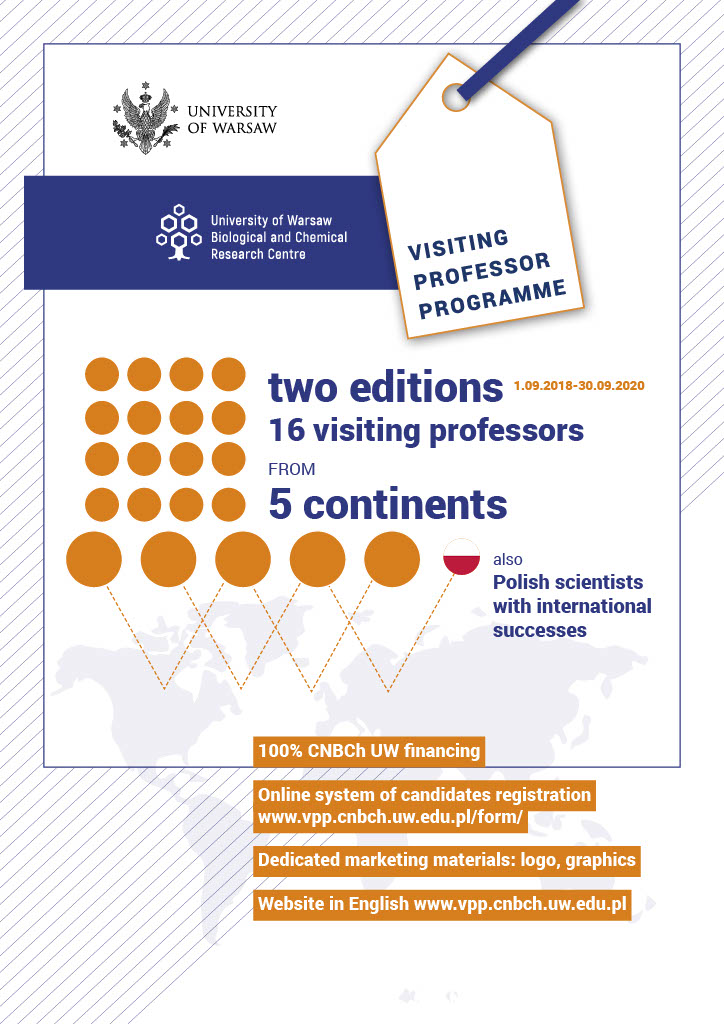 W związku z zakończeniem projektu Visiting Professor Programme (VPP) realizowanego w latach 2019-2020 w CNBCh UW, przedstawiamy Państwu podsumowanie zrealizowanych aktywności. Były to przede wszystkim wizyty Profesorów Wizytujących, osób wybranych przez Kierowników Grup Badawczych z CNBCh UW i zaakceptowanych przez Radę Naukową CNBCh UW. Cieszymy się, że mogliśmy gościć tak wielu uznanych naukowców, którzy dzielili się swoją wiedzą i doświadczeniem, nie tylko w ramach wygłoszonych wykładów ale bardzo często w trakcie bezpośrednich kontaktów.